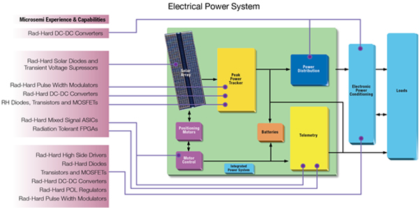 Microsemi solves problems at all stages of design and implementation, including power conversion and distribution, radio and radar signal processing, system telemetry and control, digital logic integration, and semiconductor packaging. The company is committed to helping its customers meet their most difficult space system design challenges.